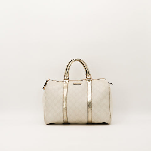 Le Boston Joy de Gucci est un sac au format bowling au style affirmé, ici décliné dans une finition argentée lumineuse. Sa silhouette structurée et sa belle capacité en font un modèle idéal au quotidien, alliant allure vintage et praticité.